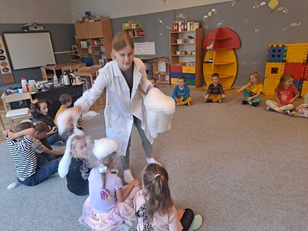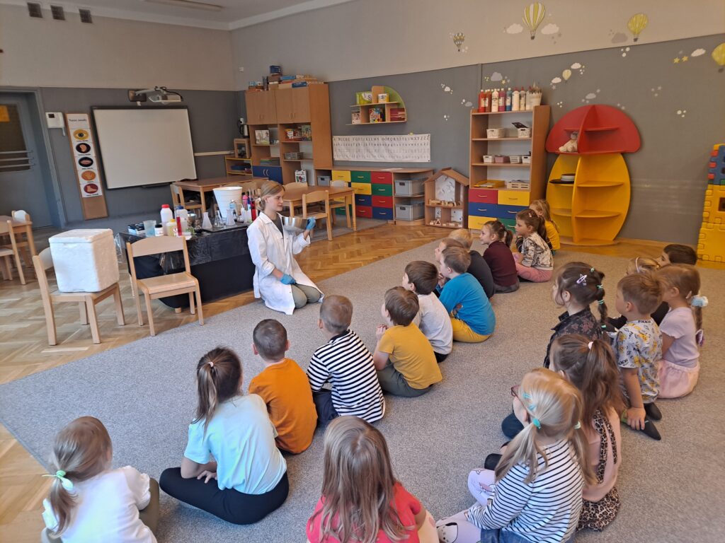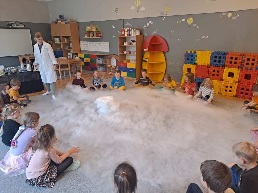 W naszym przedszkolu odbyły się niezwykle ciekawe zajęcia naukowe. Dzieci z ogromnym zainteresowaniem obserwowały różne eksperymenty. Mogły zobaczyć, jak powstaje gęsta mgła z suchego lodu, jak tworzą się bąbelki i piana, a nawet dotknąć „dymu”. Podczas zajęć panowała atmosfera zaciekawienia, radości i dobrej zabawy. Pokaz był doskonałą okazją do nauki przez zabawę, dzieci mogły przekonać się, że świat nauki jest naprawdę fascynujący!