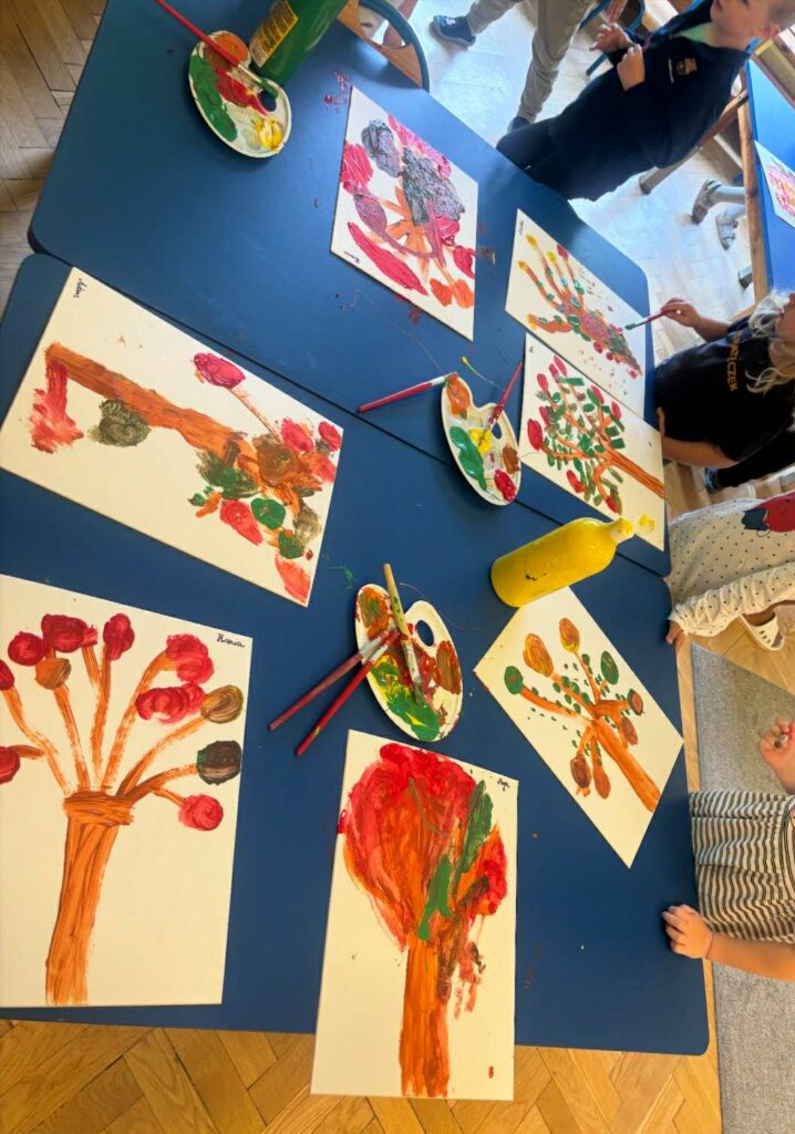 W ramach projektu „Gospodarstwo” nasza grupa dowiedziała się m.in., jakie drzewa owocowe rosną w sadzie i jakie owoce z nich zbieramy. Dzieci wykonały również prace plastyczne – swoje własne drzewa w sadzie, malując je farbami.