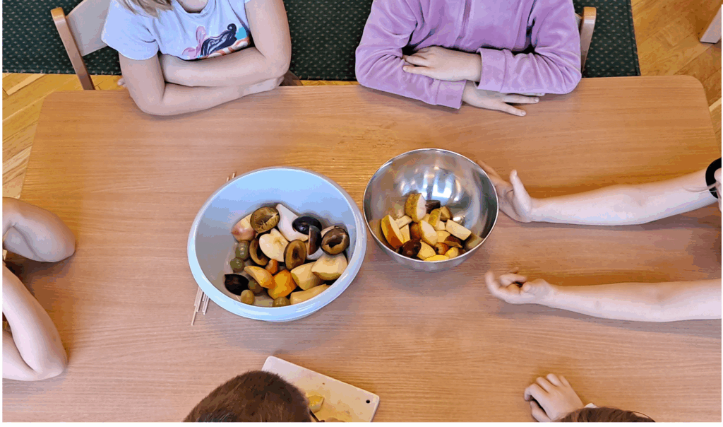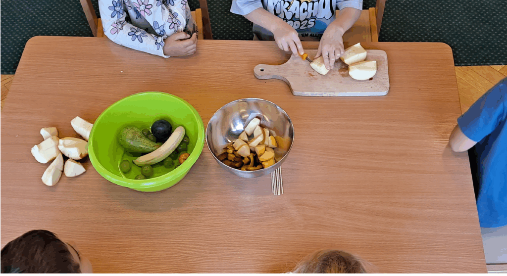 16 października br. odbyły się zajęcia kulinarne. Dzieci wspólnie przygotowywały pyszne i zdrowe szaszłyki. Zanim przystąpiliśmy do działania, dzieci poznawały owoce za pomocą zmysłów. Każdy miał okazję spróbować swoich sił w krojeniu owoców i rozpoznawaniu ich zapachu oraz smaku. Rozmawialiśmy również o tym, dlaczego warto jeść owoce i jak pomagają nam, aby być silnym i zdrowym. Zajęcia sprawiły wszystkim wiele radości, a wspólna degustacja była pysznym zwieńczeniem dnia!