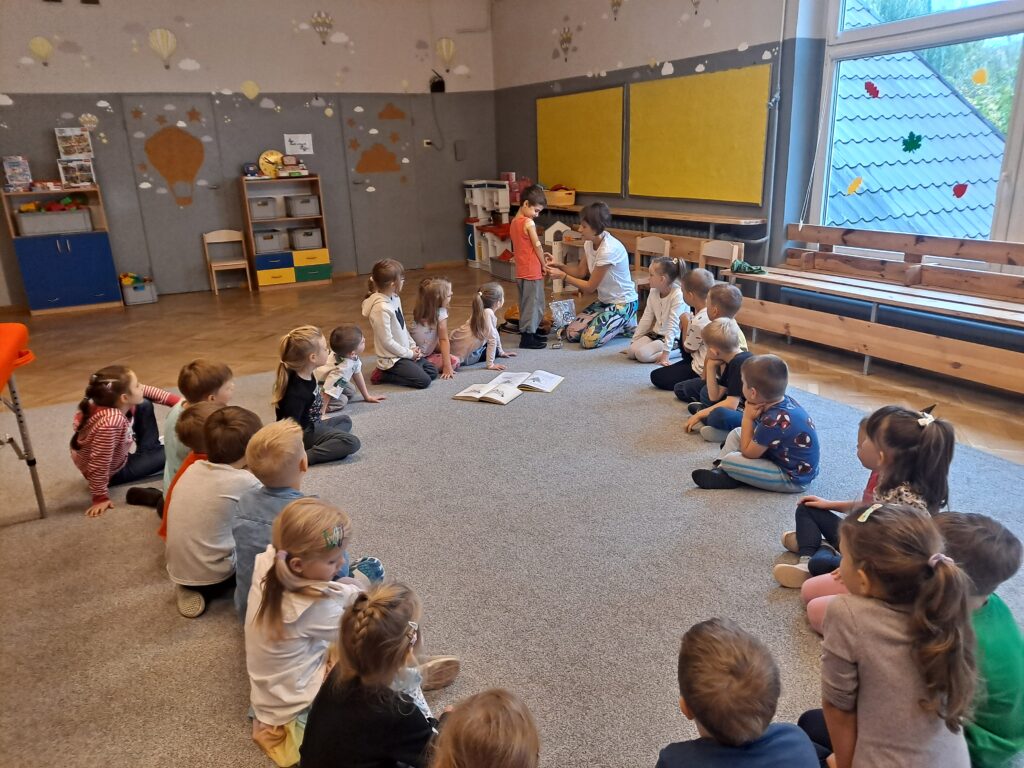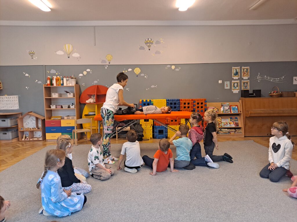 Dzieci z grupy Pszczółek wzięły udział w niezwykle ciekawych zajęciach, prowadzonych przez fizjoterapeutę – mamę Szczepana, która na co dzień zajmuje się rehabilitacją. Dzieci dowiedziały się, jak dbać o swoje ciało, prawidłową postawę oraz jak udzielać pomocy w sytuacjach, gdy ktoś się przewróci lub źle poczuje. Mama Szczepana pokazała, jak wygląda bezpieczne podnoszenie, oraz ćwiczenia wzmacniające . Zajęcia były pełne ruchu, ciekawostek i śmiechu, a przedszkolaki chętnie brały udział w pokazach i ćwiczeniach.