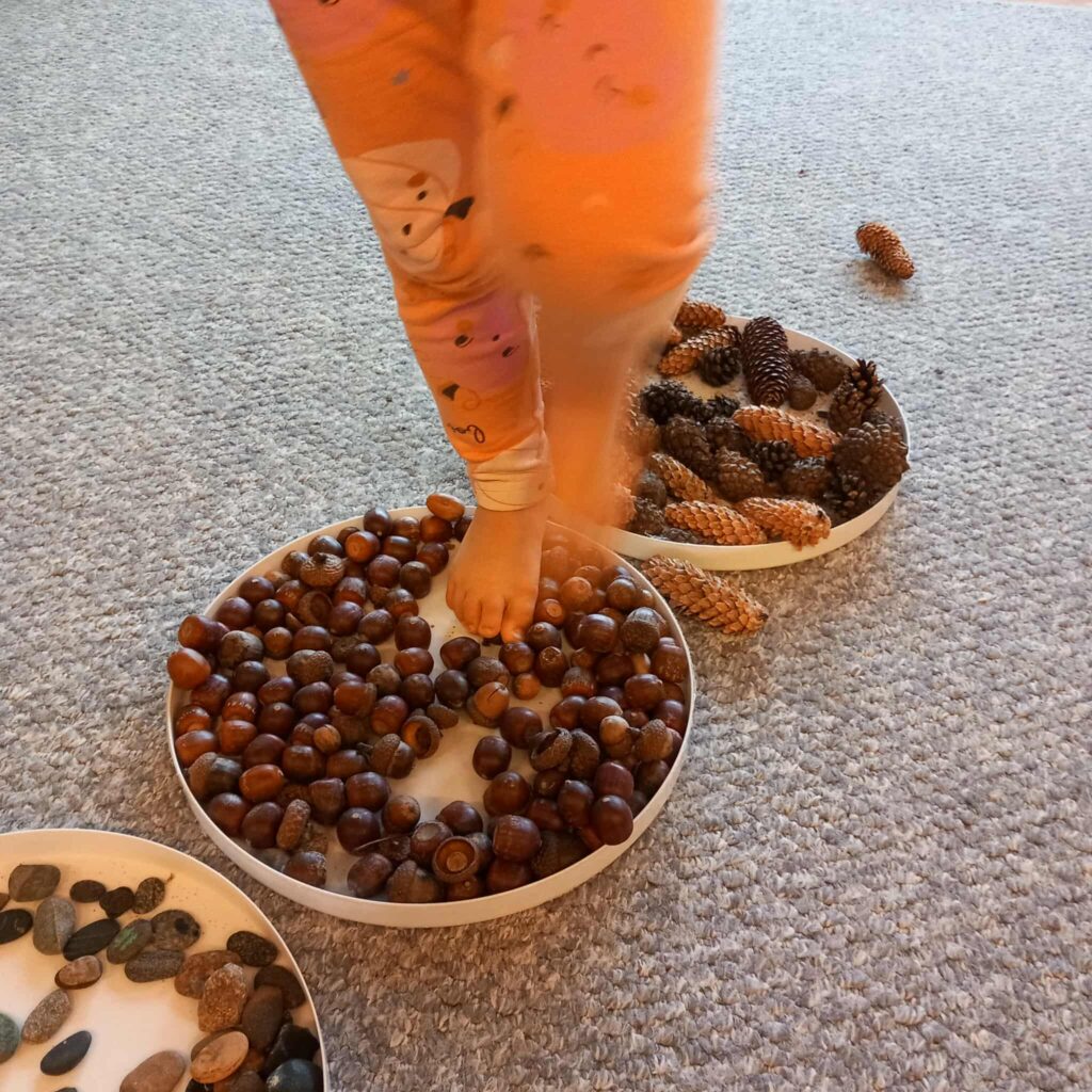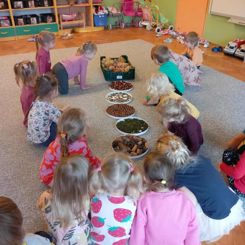 Jesienne zajęcia sensoryczne u „Ślimaczków” z wykorzystaniem darów Pani Jesieni- spacer po ścieżce sensorycznej oraz wyławianie kasztanów z kisielu.