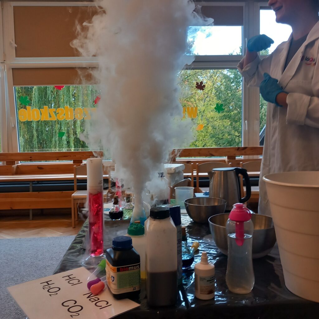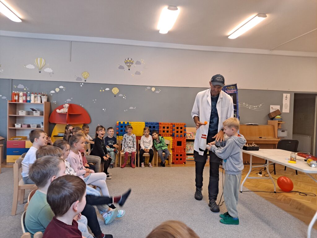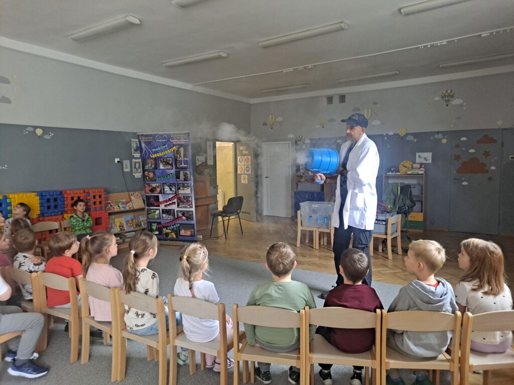 W naszym przedszkolu odbył się niezwykle interesujący pokaz naukowy „Mobilne Laboratorium”. Dzieci miały okazję uczestniczyć w serii ciekawych doświadczeń, które w atrakcyjny sposób przybliżyły im świat nauki. Podczas zajęć dzieci z ogromnym zainteresowaniem śledziły przebieg doświadczeń, z entuzjazmem zgłaszały się do udziału i aktywnie odpowiadały na pytania. Pokaz dostarczył wszystkim uczestnikom nie tylko wiedzy, ale też mnóstwo radości i inspiracji do dalszego odkrywania tajemnic nauki.