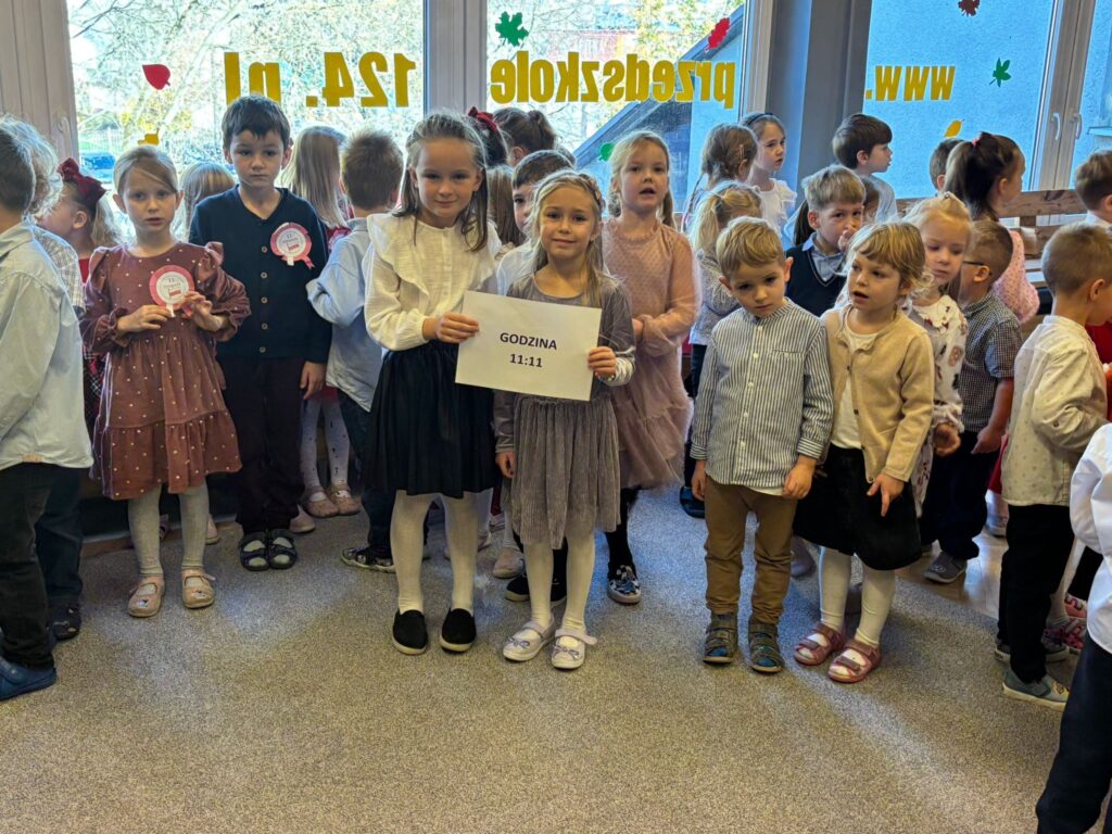 W dniu 7 listopada br. w naszym przedszkolu odbyła się uroczystość z okazji Dnia Niepodległości. Dzieci z grupy Pszczółek zaprezentowały przygotowany program, opowiedziały historię Polski, prezentując jej najważniejsze symbole i wydarzenia. Uroczystość przebiegła w radosnym, a jednocześnie pełnym szacunku nastroju, integrując całą społeczność przedszkolną  wokół tradycji narodowych. O godzinie 11:11 wszyscy wspólnie odśpiewaliśmy hymn narodowy.
