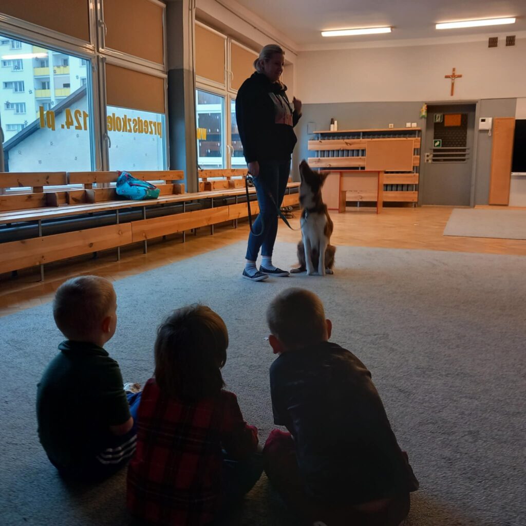 9 lutego nasze przedszkole odwiedziła p. Diana z „PsiQuss – pozytywne szkolenie psów” ze swoim podopiecznym, aby zapoznać dzieci z zasadami bezpiecznego kontaktu z psami, a także sposobami pielęgnacji psów, podstawowymi komendami oraz nauką sztuczek. Każde dziecko miało możliwość pogłaskania psa oraz poczęstowania go smaczkiem. Pani Diana uświadomiła też dzieciom, że pies to żywe, czujące stworzenie, które wymaga opieki i dobrego traktowania.