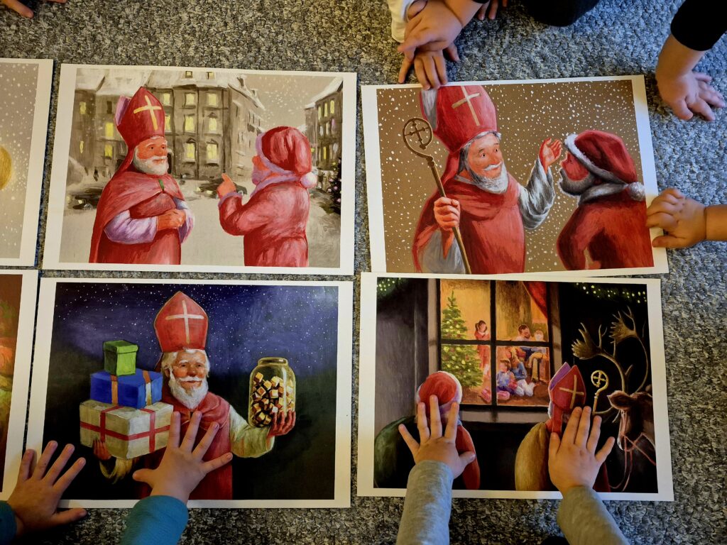 Dnia 04.12.2025 r. nasze przedszkolaki obejrzały teatrzyk kamishibai pt. „Prezenty Świętego Mikołaja”. Była to wyjątkowa opowieść o przypadkowym spotkaniu Gwiazdora ze Świętym Mikołajem. Dzieci dowiedziały się, gdzie mieszka Mikołaj, jak przygotowuje prezenty oraz komu je rozdaje. Bajka wprowadziła wszystkich w świąteczny nastrój i pobudziła dziecięcą wyobraźnię.